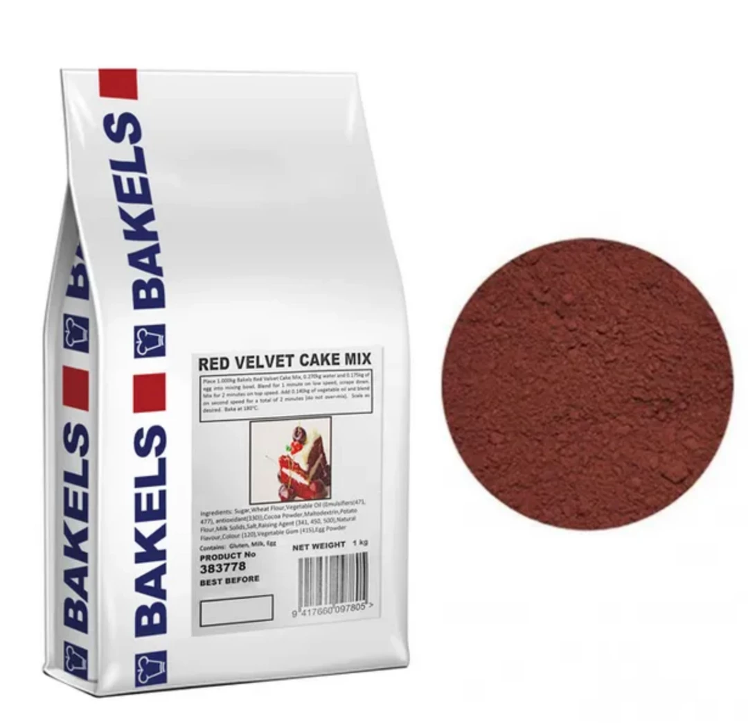 Premium Bakels Red Velvet Mud Cake mix, ruby-coloured with a rich chocolatey flavour. Ideal for cupcakes or whole cakes. 1kg bag will make one 8″ cake.
