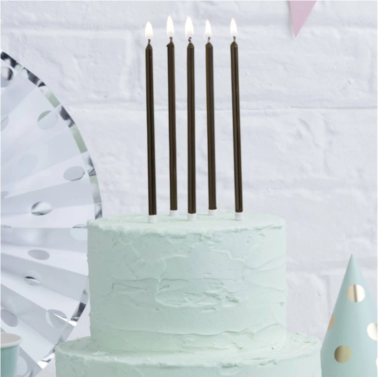 12cm tall metallic cake candles ready to brighten up any birthday cake. Available in Gold, Black, Rose Gold & Pearlised White. Choose below!