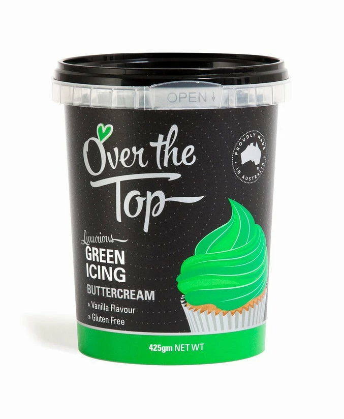 This ready to use vanilla buttercream icing in green by Over the Top features a silky smooth texture with superior piping consistency. The Over the Top buttercream has a superior crusting buttercream style which is one that will set up firmly enough so that it can be touched lightly without leaving a mark. Crusting buttercream makes a strong base that you can later apply additional designs on.