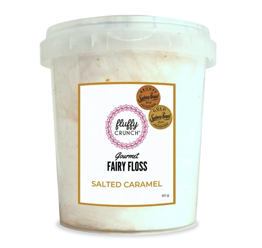 Our fanciest flavour and most awarded creation.A sensation combination of sweet & savoury. Caramel flavoured fairy floss dusted with powdered honeycomb and a pinch of Himalayan pink salt.