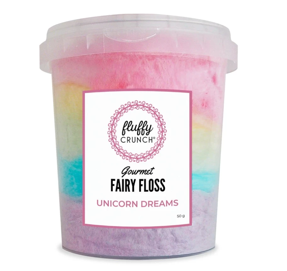 What do you unicorns dream of? Rainbow coloured Fluffy Crunch of course. A combination of Grape (Purple), Raspberry (Blue), Watermelon (Green), Banana (Yellow) & Strawberry (Pink) fairy floss, topped with a crunch of edible sprinkles.