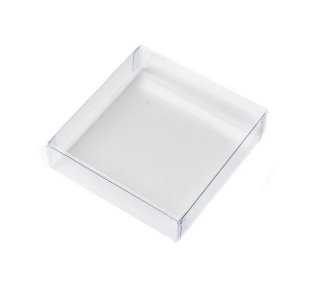 Two Piece Cardboard Box with Clear Lid, the size is 75mm x 75mm x 30mm. Gloss White Cardboard Base and Gloss White Cardboard Insert with a Clear Plastic Lid.