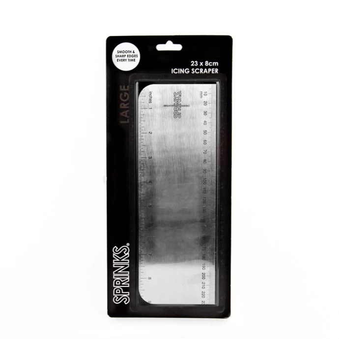 Ensure that you have smooth and clean edges on buttercream and ganache cakes with this easy to use stainless steel icing scraper.
