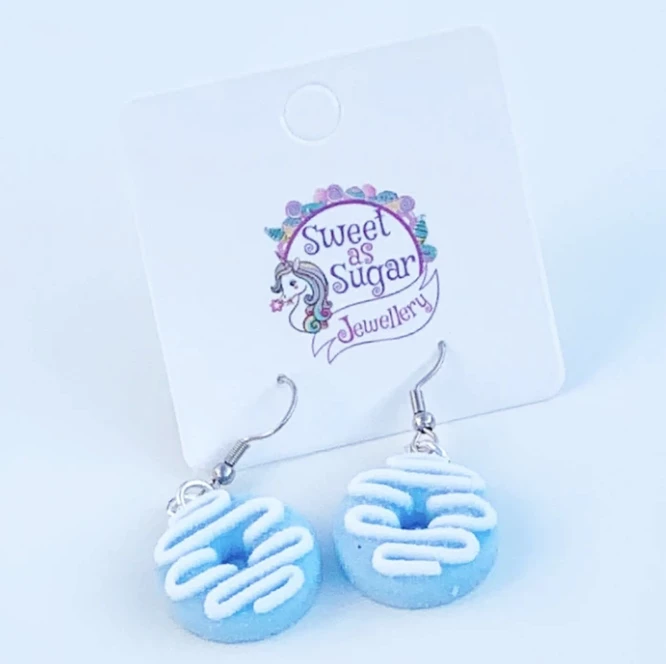 Blue or pink iced donut earrings made with surgical steel hooks and posts.