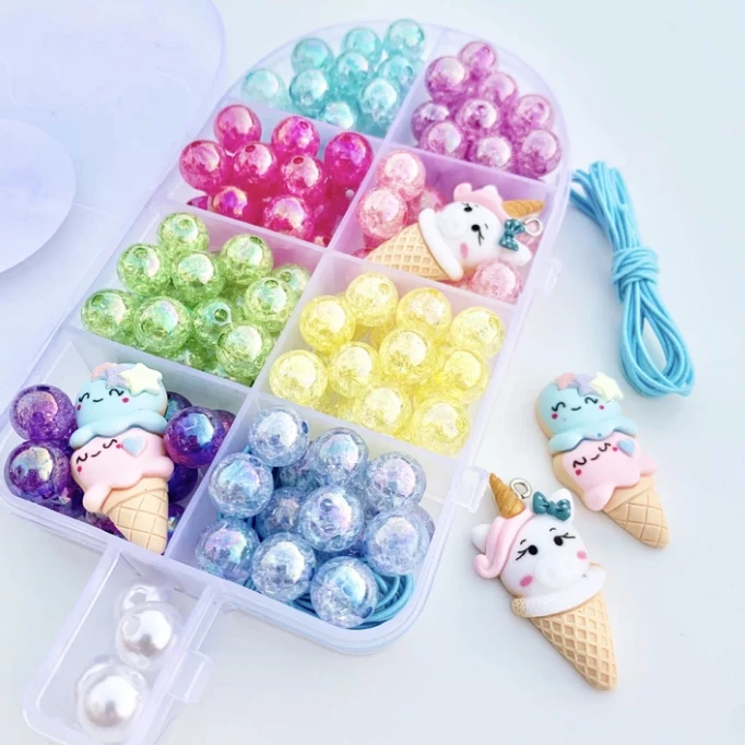 Kit comes with 10 different colour beads, blue necklace string, 2 ice cream charms.Â