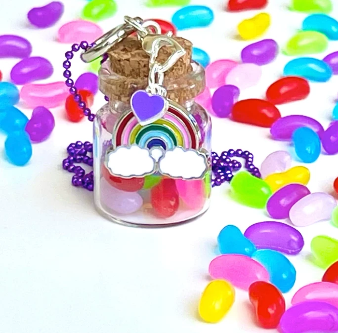 Cute little jar charm filled with jellybeans with a rainbow and heart charm on a purple chain necklace.