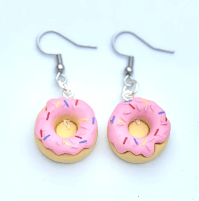 Pink iced donut with sprinkles earrings made with surgical steel hooks and posts.