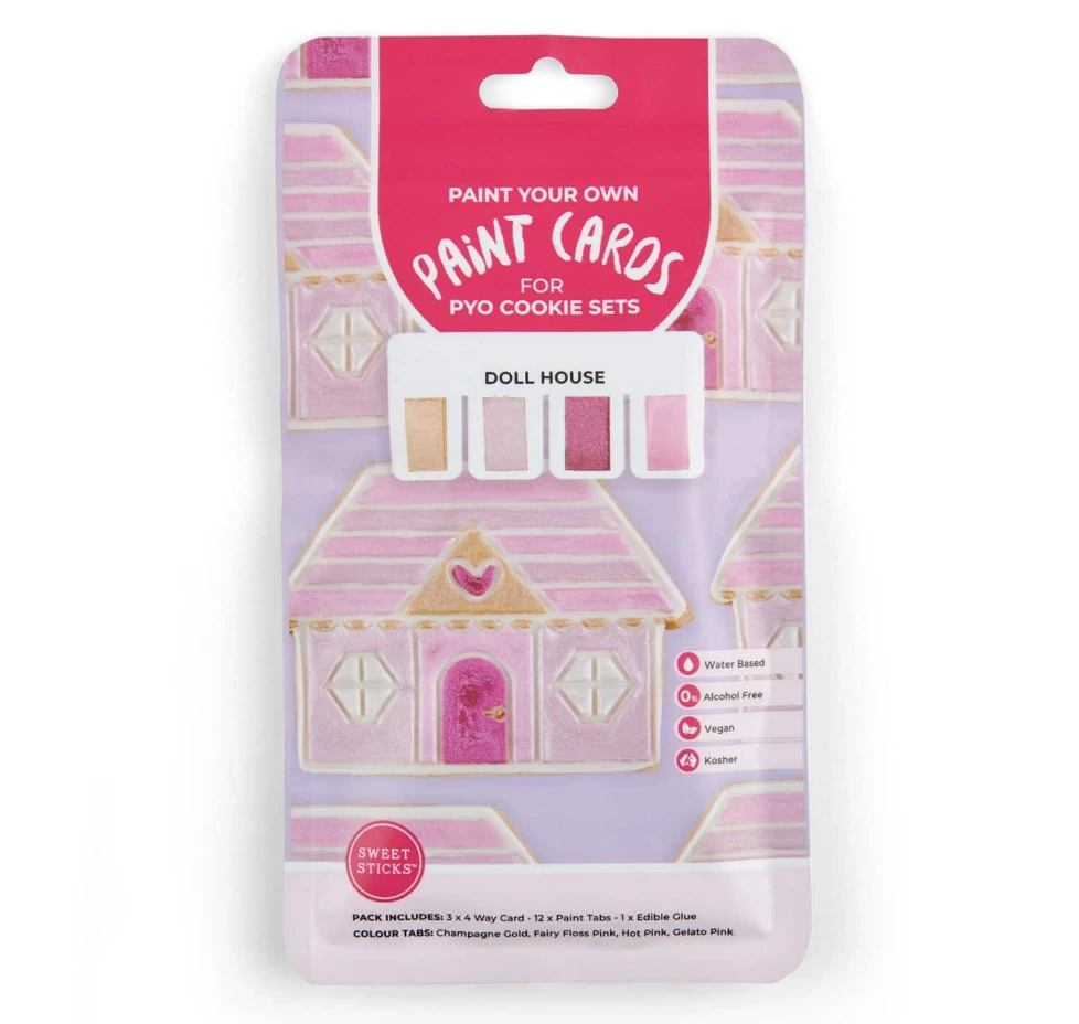 Pretty in pink is our ‘Doll House’ themed Paint Your Own system. Our PYO paint cards were developed when the brand had to pivot during the pandemic in 2020. With such an overwhelming response from the industry we have worked really hard at trying to keep this product viable for all. These paint cards are designed for you to add to your own PYO cookie kits. The paints are from our Metallic Water Activated range therefore leaving you with a high pigmented, 100% edible product that your customer or family can really enjoy.