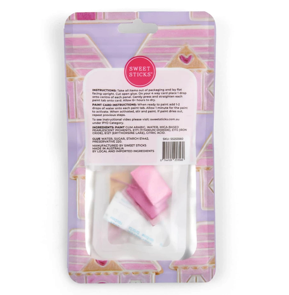One complete 4 way paint card has enough paint to cover 2-4 large cookies. Sweet Sticks PYO packs are child friendly and safe to consume making it the perfect edition to your weekend antics with the kids or to add to your PYO Cookie Kits. Include a food grade PYO brush to your kits ensuring you have an all round edible product for your customer.