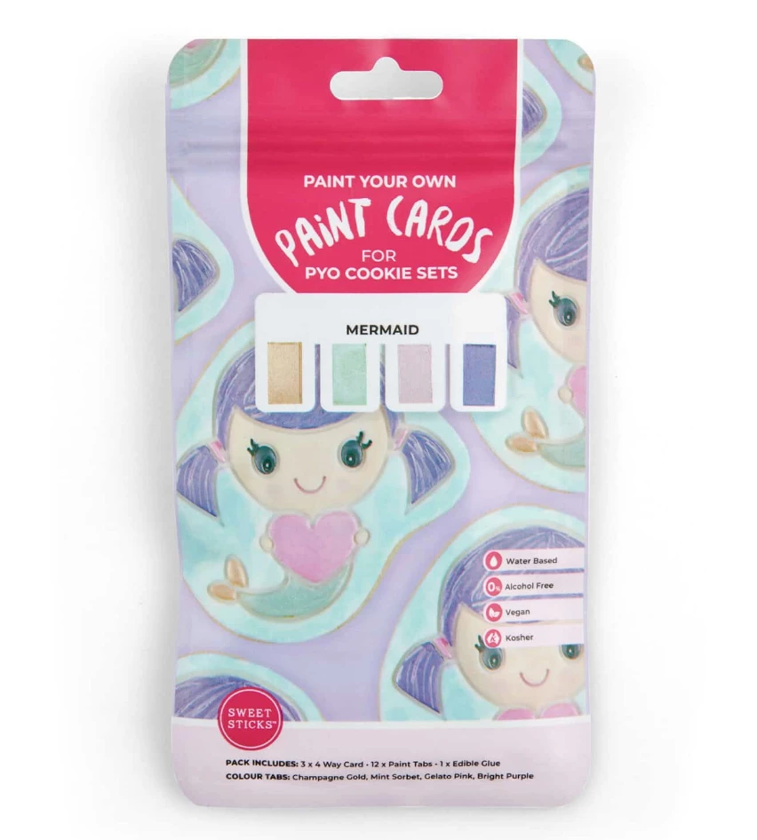 Let your ‘Mermaid’ tails create delicious treats with our very own unique Paint Your Own system. Our PYO paint cards were developed when the brand had to pivot during the pandemic in 2020. With such an overwhelming response from the industry we have worked really hard at trying to keep this product viable for all. These paint cards are designed for you to add to your own PYO cookie kits. The paints are from our Metallic Water Activated range therefore leaving you with a high pigmented, 100% edible product that your customer or family can really enjoy.