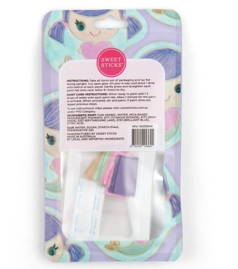 One complete 4 way paint card has enough paint to cover 2-4 large cookies. Sweet Sticks PYO packs are child friendly and safe to consume making it the perfect edition to your weekend antics with the kids or to add to your PYO Cookie Kits. Include a food grade PYO brush to your kits ensuring you have an all round edible product for your customer.