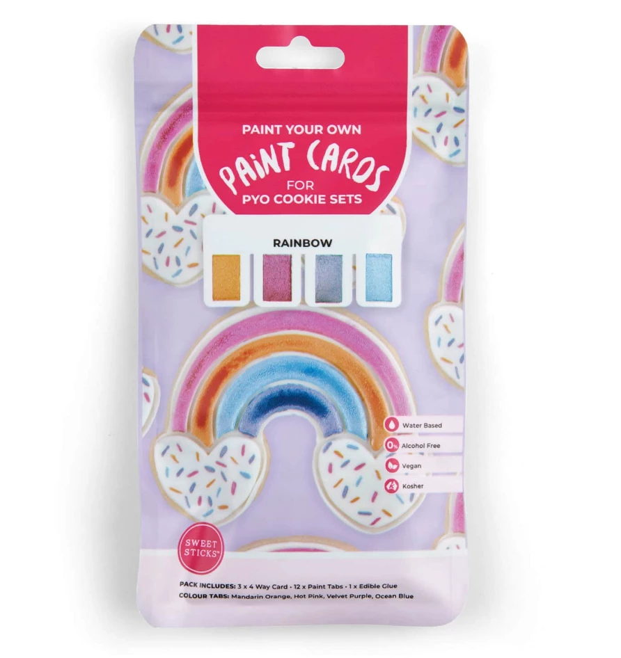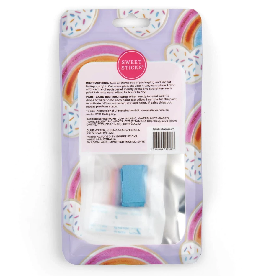 One complete 4 way paint card has enough paint to cover 2-4 large cookies. Sweet Sticks PYO packs are child friendly and safe to consume making it the perfect edition to your weekend antics with the kids or to add to your PYO Cookie Kits. Include a food grade PYO brush to your kits ensuring you have an all round edible product for your customer.