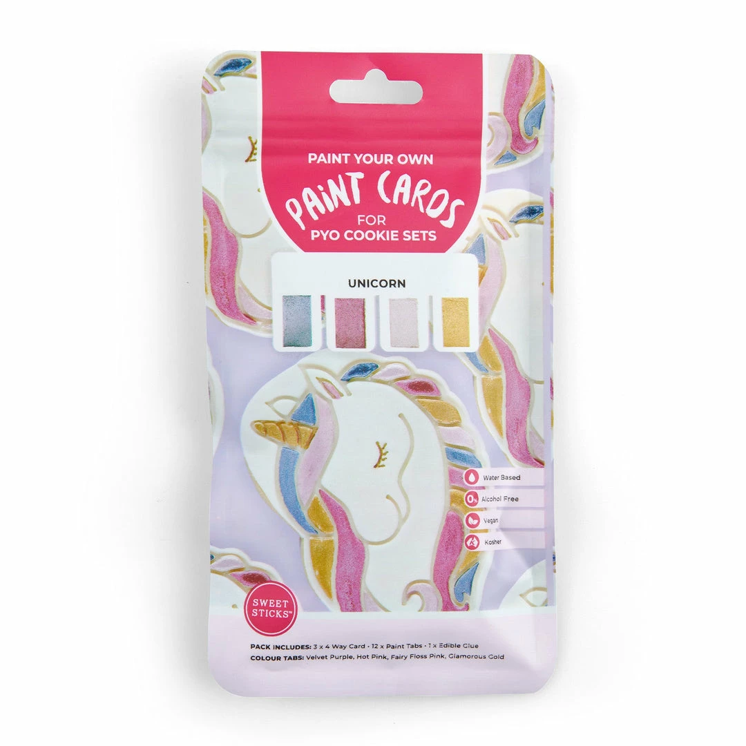 Magical ‘Unicorn’ Cookies? Yes please. Introducing our unique ‘Unicorn’ themed Paint Your Own system. The PYO paint cards were developed when the brand had to pivot during the pandemic in 2020. With such an overwhelming response from the industry Sweet Sticks have worked really hard at trying to keep this product viable for all. These paint cards are designed for you to add to your own PYO cookie kits. The paints are from the Sweet Sticks Metallic Water Activated range therefore leaving you with a high pigmented, 100% edible product that your customer or family can really enjoy.