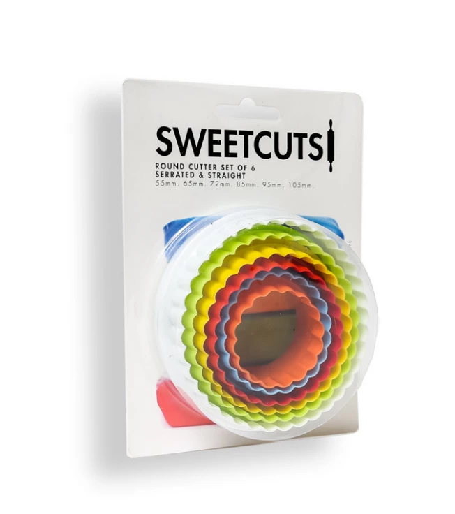 Set includes 6 circle shaped cutters with serrated and straight edges: 55mm, 65mm, 72mm, 85mm, 95mm & 105mm.